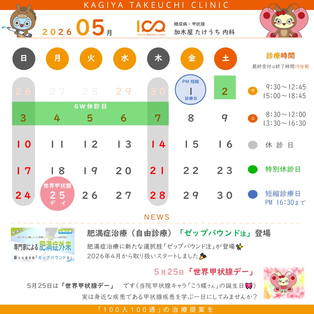 ~甲状腺疾患を見逃さないために~ こんにちは! 「糖尿病・甲状腺 加木屋たけうち内科」院長の竹内です! 本日5月25日は「世界甲状腺デー」です! この投稿では「世界甲状腺デー」について紹介したい…